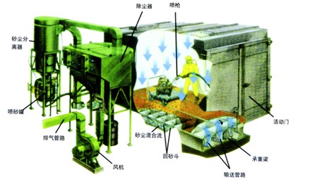 a、省去了常規(guī)噴砂室砂料輸送循環(huán)系統(tǒng)的螺旋和皮帶輸送機(jī),斗式提升機(jī)以及地下工程,不需建造地坑,節(jié)約了地基施工費(fèi)用,大大節(jié)約了工程成本;